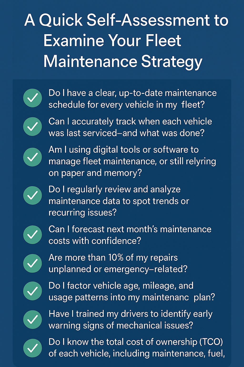 Before you dive deeper into overhauling your maintenance approach, let’s evaluate your current state. Here is a set of questions to help you self-check your fleet maintenance strategy and identify blind spots, inefficiencies, and opportunities for improvement.